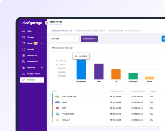 Suas decisões estratégicas serão muito melhor fundamentadas a partir das consultas aos relatórios oferecidos por nossa plataforma. Descubra qual marca e modelo são mais vendidos, que épocas do ano as vendas estão melhores, qual o lucro de sua loja, entre outros.
